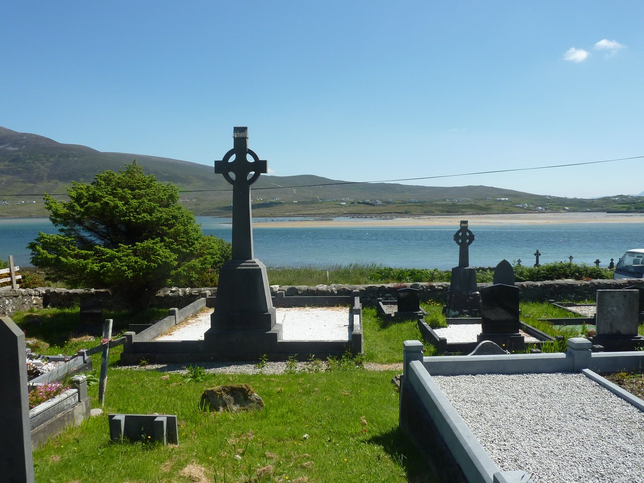 Achill - Kildownet Cemetary - 10 "tattie howkers" or potato pickers, all from Achill, lost their lives in a fire at a bothy where they were sleeping in the early hours of Thursday, 16th September 1937 at No 67, Eastside, Kirkintolloch, Scotland. The cause of the fire has never been explained. Their bodies were carried by train on the Westport to Achill line which closed that year. Traditionally people from Achill travelled to Scotland for seasonal work picking potatoes. They usually travelled in groups based on family and locality.
