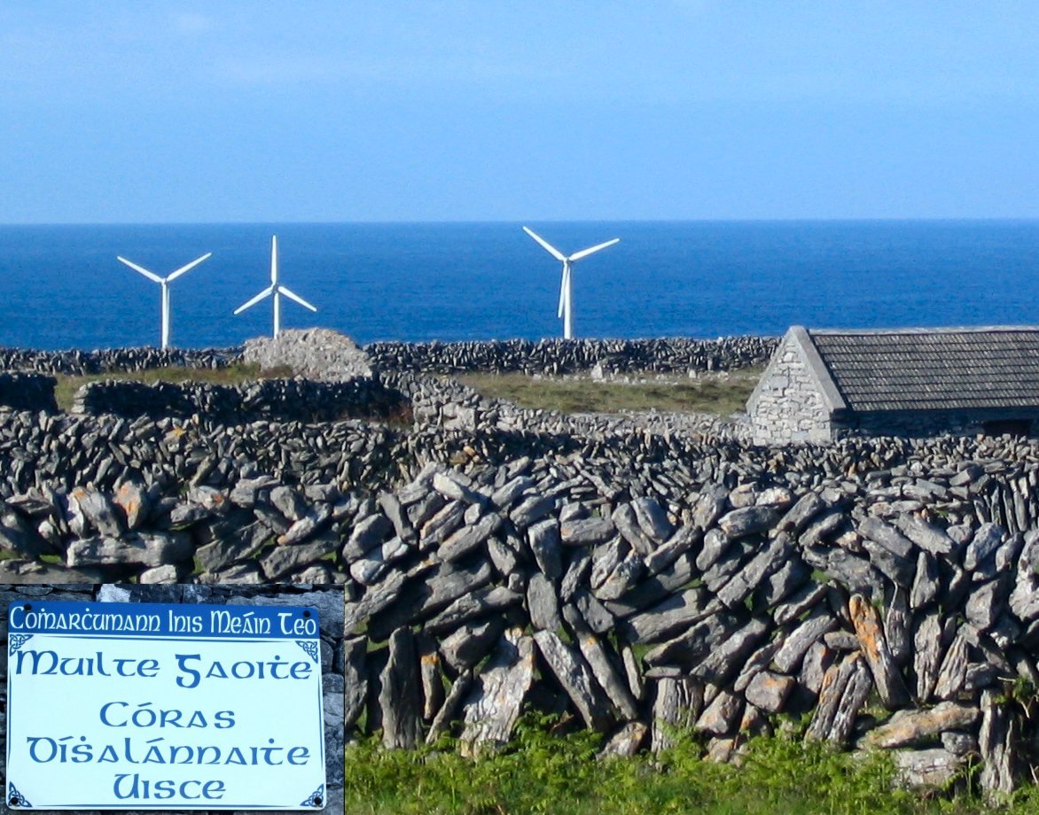Inis Meáin - The sign reads - 'Windmills. Water desalination plant' On the sign, note the dot (séimhiú) above five letters e.g. above the t in gaoite. This is an oldish usage - for a long number of years this word would be rendered as 'gaoithe' with a h intead of the dot. This is by no means the only sign like this on Inis Meáin.