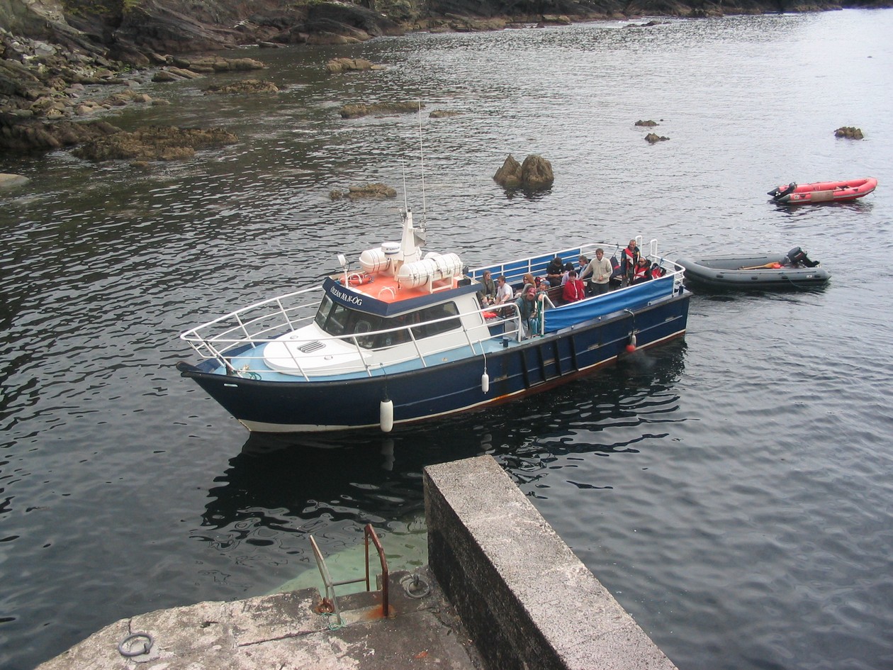 Blaskets - ferry at Dún Caoin with rubber landing boat in tow.