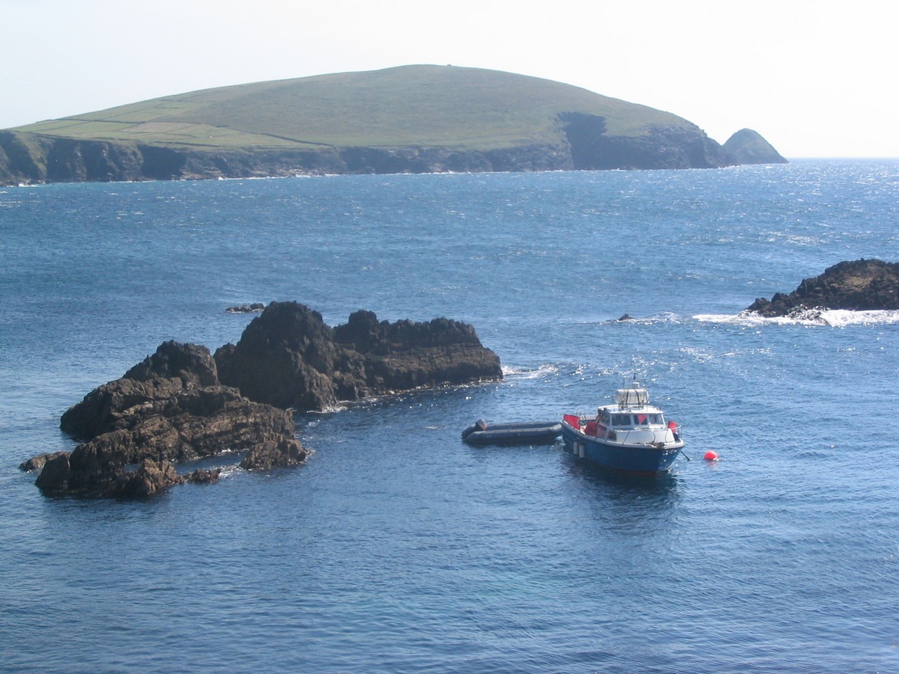 Blaskets - the ferry with attached rubber dinghy at Dún Caoin with the Great Blasket in the background