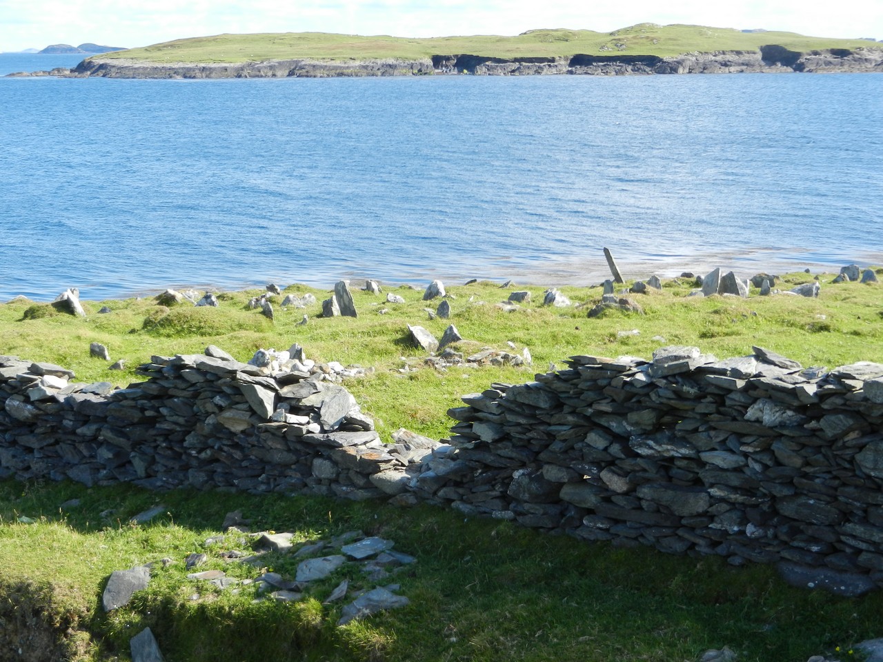 Inishark - the island graveyard above the landing place, the uncarved, uninscribed upright stones are grave markers.