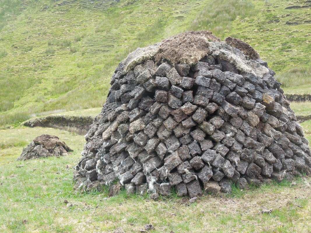 Clare Island - A stack of dried turf (peat) on the side of KnockMore (463m) the highest point on Clare Island. The turf was cut from the bank above teh wet ditch on the right. See the previous photograph