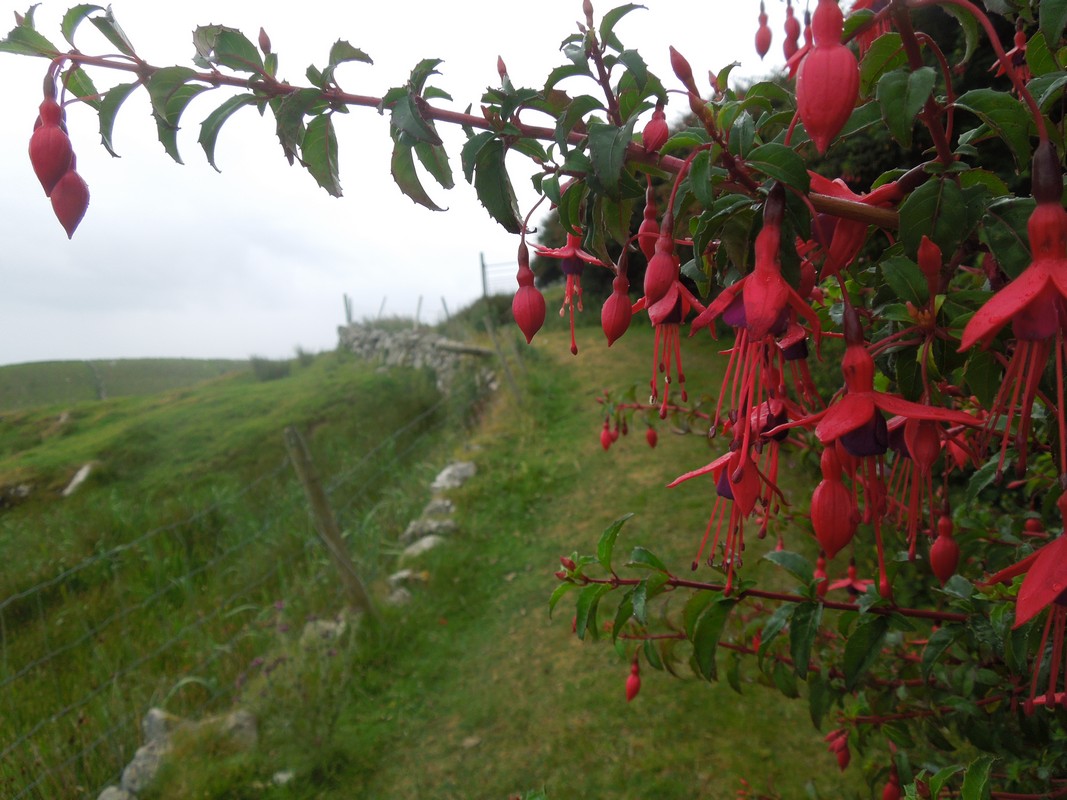 Clare Island - - The muted colours of fuchsia on a wet day. Fuchsia magellanica - Fuchsia - Fiúise (a native of South America now one of the most common noticable flowering plants around the coast of Ireland.