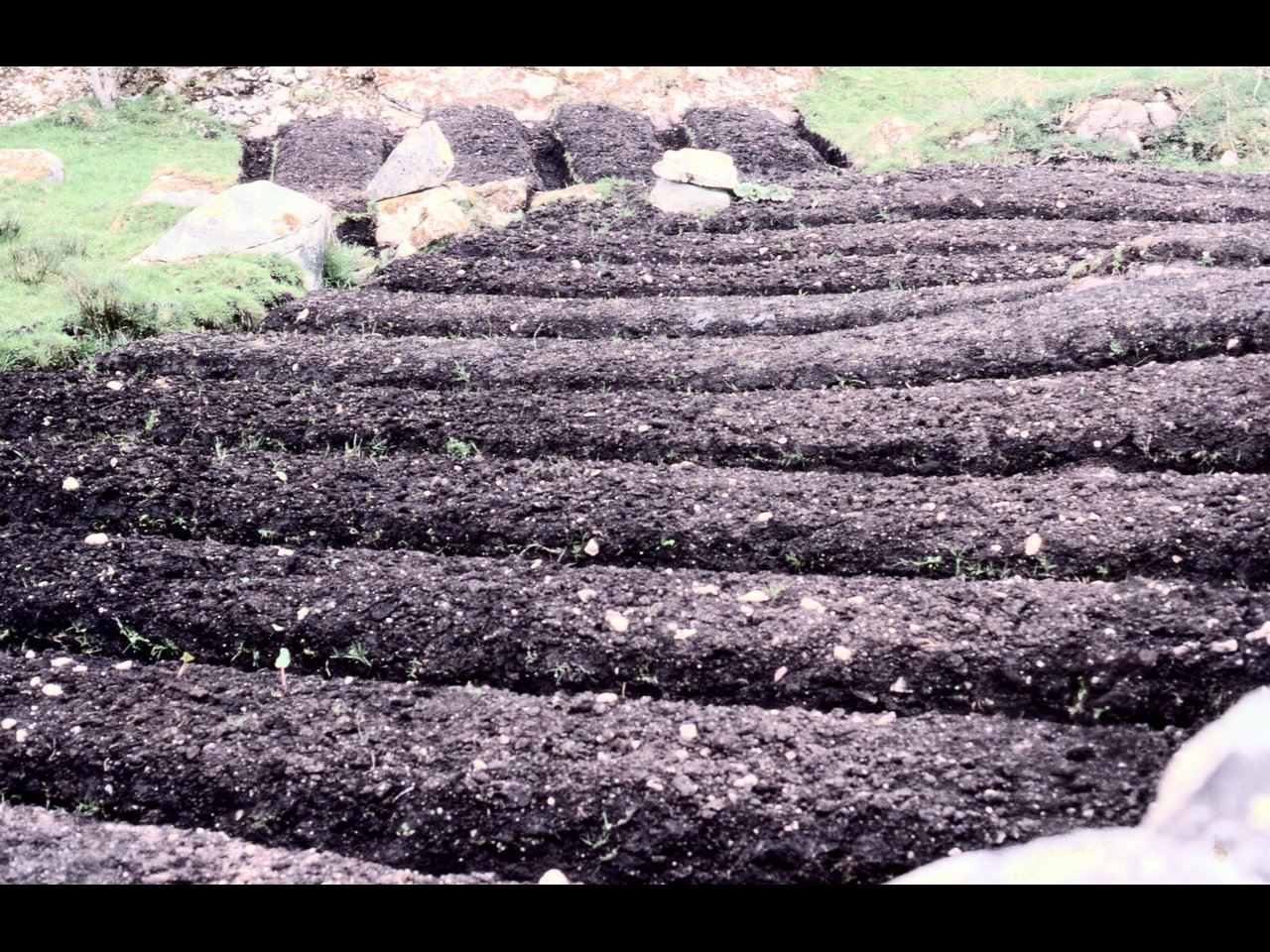 na hOileáin - "lazy beds" prepared for growing potatoes. In many places eroded undulations in the ground show where such lazy beds were made in the past.