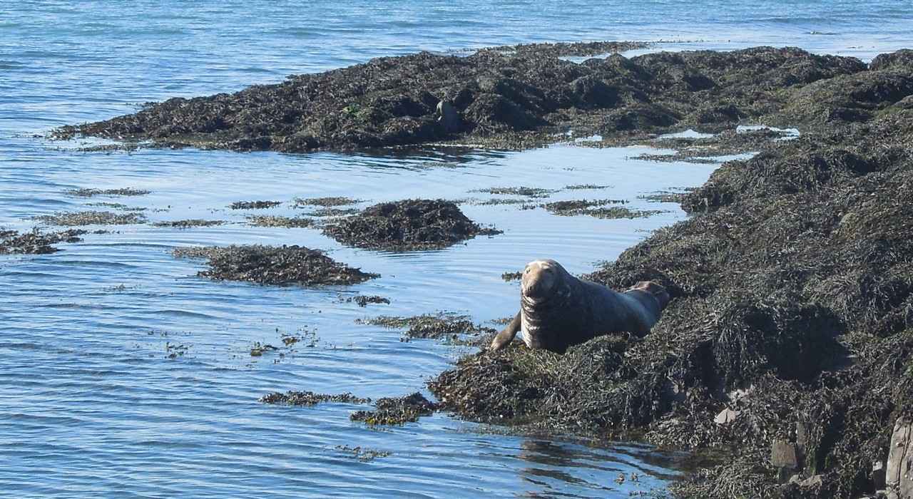 Copeland Islands - a seal hauled out on the seaweedy low tide rocks at South Landing