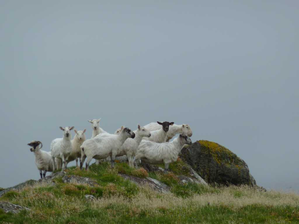 Sheep huddling on a high point from unfamiliar human presence.