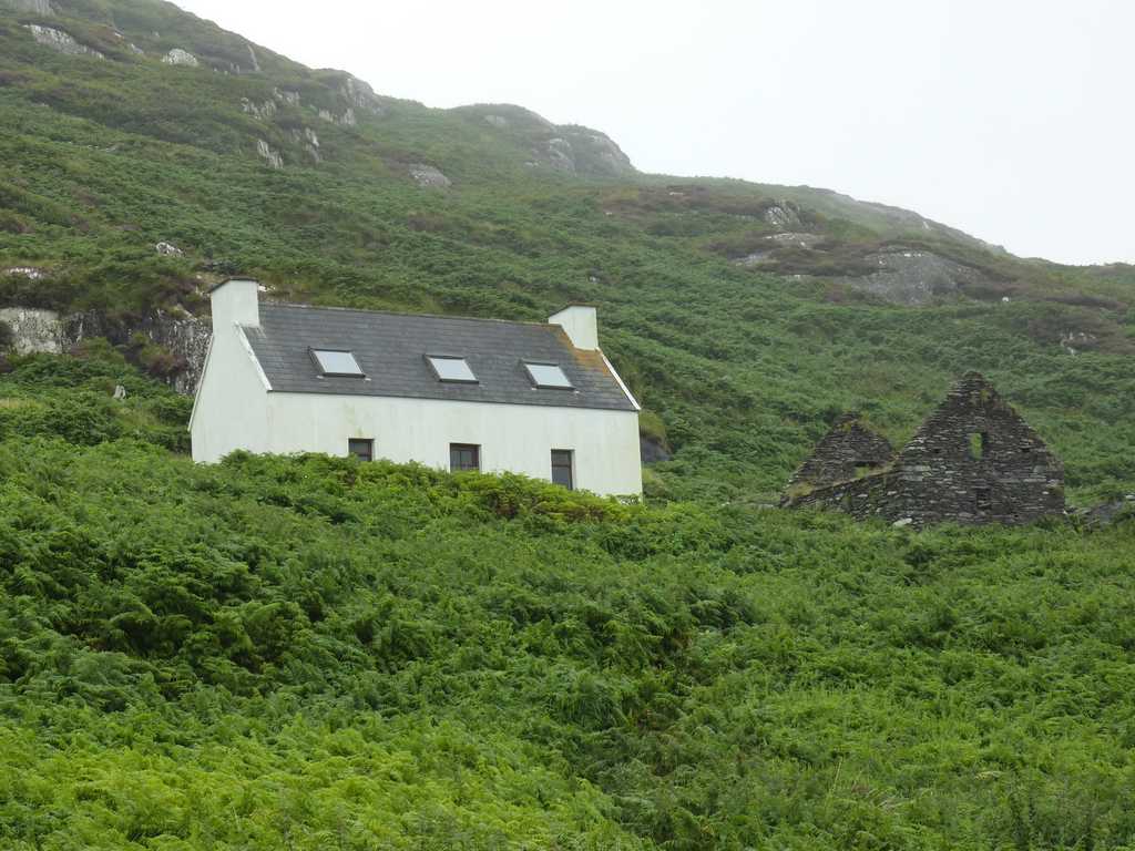 Deenish's only habitable house sheltered under the hill above the landing beach .
