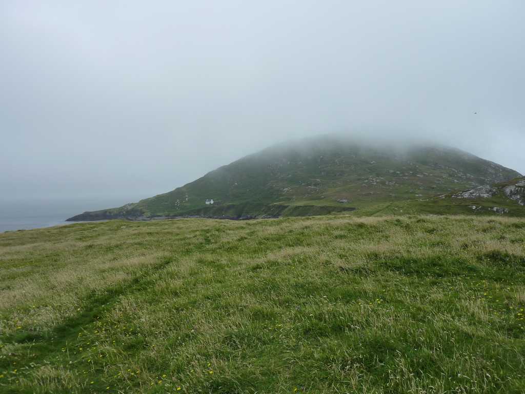 Looking south towards Deenish's high point with, huddled for shelter beneath it, the tiny abandoned human settlement sitting above the landing place.