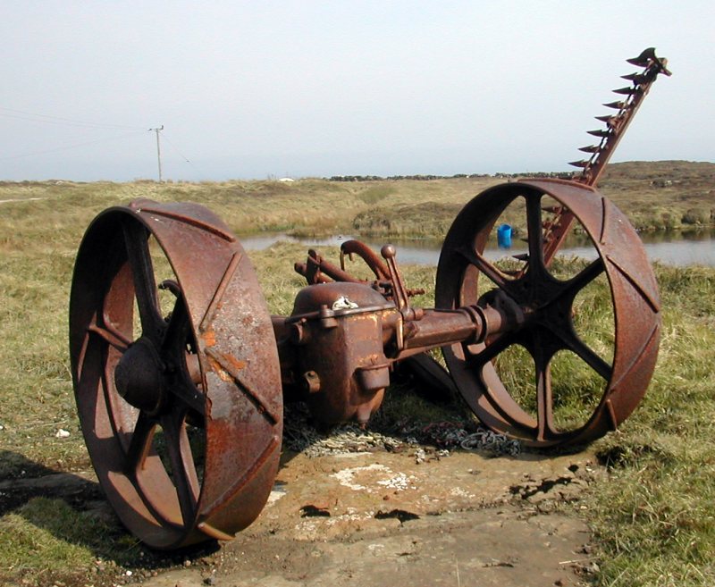 An old machine for cutting hay rusting at the side of the road near the Eeat Lighthouse