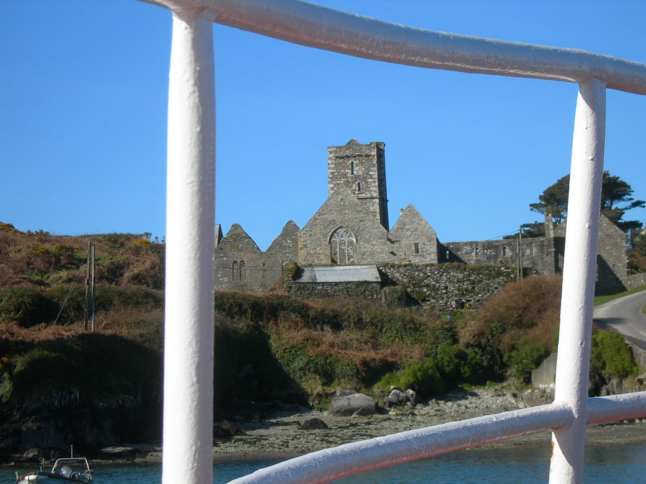 Sherkin - Sherkin Abbey seen from the ferry arriving at the pier.