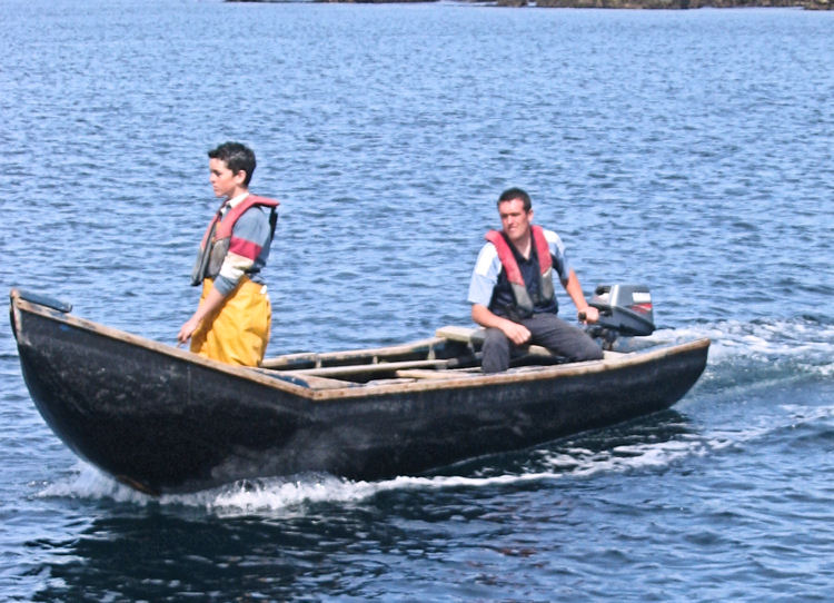 Pilgrims arrive on boats from InishTurk, Roonagh Pier on the mainland, Clare Island to the north and possbily even from Inishbofin to the south. On arriving pilgrims tranship to currachs for the landing on Caher. There is no pier on the island.