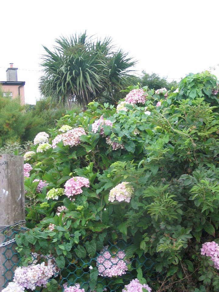 Valentia Island - Hydrangea flowers and a cordyline 'palm', a plant which was introduced to Europe from New Zealand